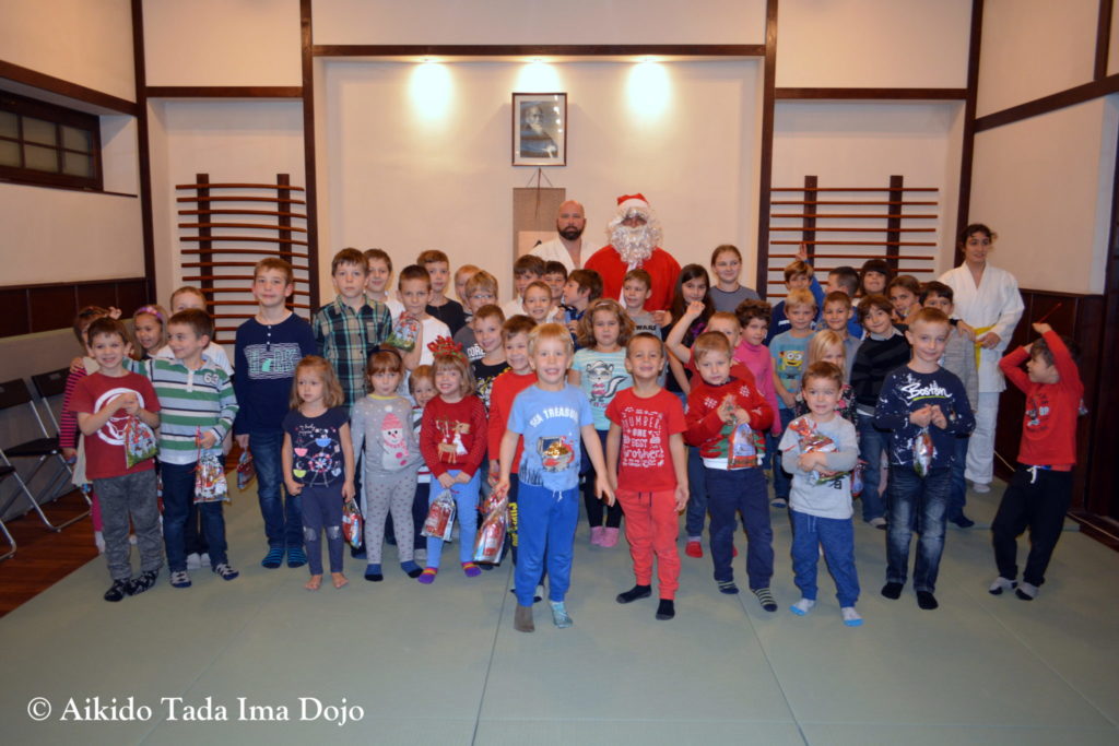 Az ovis és alsós gyermek csoportokba járó kis aikidokák (gyakorlók) együtt várták a Mikulást, akinek rajzokkal, énekekkel, versekkel, sőt a nagyobbak aikido technika bemutatásával kedveskedtek.